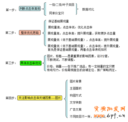 做好了引流,就需要談論點擊率,點擊率公式為:點擊率=點擊量/展現量。怎樣優化點擊率,從公式可以看出,一是增加點擊量,二是減少不必要的展現,下面一張圖簡單的概括了點擊率優化的流程:
